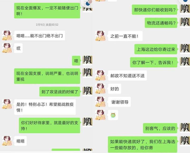 对在疫区的同事,学院直属支部领导每周电话慰问,了解其防疫和生活等方面的情况,并要求行政部做好关心慰问工作。经与身在武汉的同事联系,得知她家中的食物已经没有多少了,学院行政部决定在上海采购生活物资给她寄去。行政部主任咨询了数家快递公司,除顺丰、EMS外大多公司均表示不收寄往武汉的包裹,其中顺丰除可以接受3公斤以内的防疫物资包裹外,至2月15日也不接受任何快递;EMS不保证时效。最后决定用EMS为同事快递,截至目前通过快递已分3次寄去防疫物资、干货、绿豆、小黄米等生活物资,介于武汉生活物资统一采购的前提下,还寄去了茶叶、咸菜、红枣等不在采购范围内的食品。学院行政部郭强主任每隔两三天会询问日常生活,分享了生豆芽、读书等生活心得。行政部同事施蓓蕾从封城伊始就与疫区同事一直保持联络,分享采购途径、并寄去防疫物资。