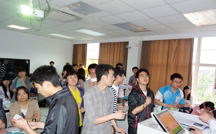 5月17日下午1点,在上海财经大学国定路校区的公共经济与管理学院实验室里,东风公司财务管理课程进修班全体学员与财大研究生共同参与了ERP沙盘模拟经营训练。
