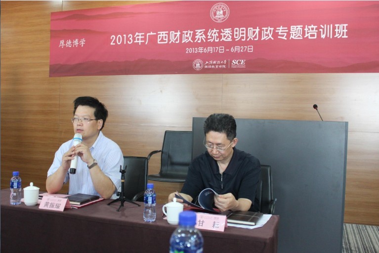 2013年6月17日上午,2013年广西财政系统透明财政专题培训班典礼在我校中山北一路校区博思楼403报告厅隆重举行。出席本次开学典礼的领导嘉宾有:广西壮族自治区财政厅培训中心甘耘主任、上海财经大学继续教育学院院长助理黄振耀副教授。