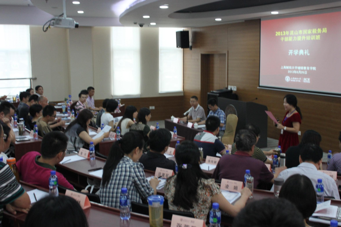 2013年8月26日上午8:30,2013年昆山市国家税务局干部能力提升班(第二期)开班典礼在我校中山北一路369号校区博思楼401教室隆重举行。昆山市国税局信息中心徐龙主任以及上海财经大学继续教育学院院长助理朱照定出席了开班典礼。