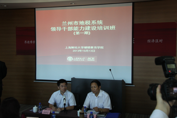2013年10月13日上午,兰州市地税系统领导干部能力建设培训班开班典礼在我校中山北一路校区博思楼404报告厅隆重举行。出席本次开学典礼的领导嘉宾有:兰州市地方税务局党组书记、局长刘永智先生,上海财经大学继续教育学院院长助理朱照定先生。