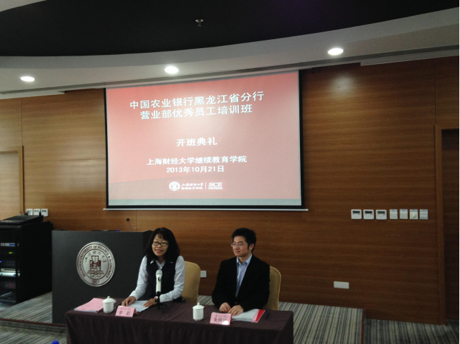 2013年10月21日上午8:30,《2013年中国农业银行黑龙江省分行营业部优秀员工培训班》开班典礼在我校中山北一路369号校区博思楼401教室隆重举行。中国农业银行黑龙江省分行营业部人力资源部副总经理李莉女士以及上海财经大学继续教育学院院长助理朱照定先生出席开班典礼。