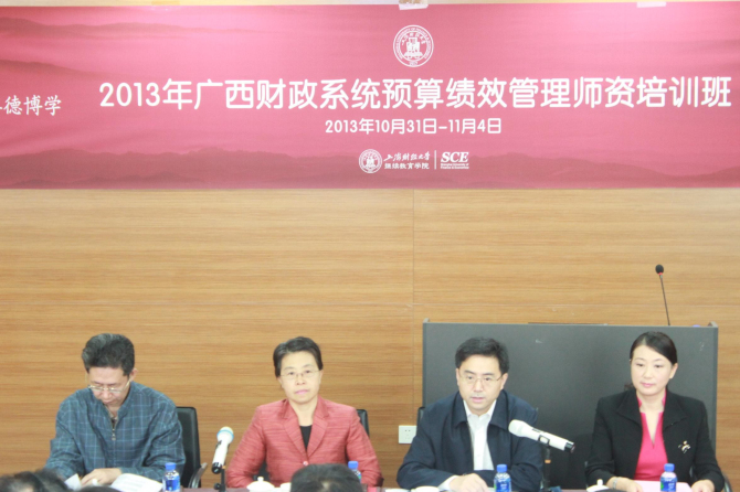 2013年10月31日上午,广西省财政系统绩效管理师资培训班开班典礼在我校中山北一路校区隆重举行。出席本次开学典礼的领导有:广西财政厅副厅长董仕军、上海财经大学副校长黄颖、广西财政厅干部教育中心主任甘耘。开班典礼由继续教育学院副院长钱淑萍主持。