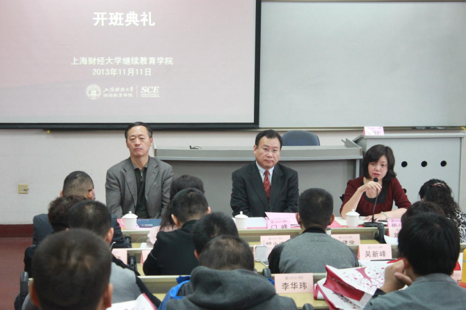 2013年11月11日上午,住房公积金资金管理培训班开班典礼在我校中山北一路校区第七教学楼402教室隆重举行。出席本次开学典礼的领导嘉宾有:新疆维吾尔自治区住房和城乡建设厅处长胡小清女士,新疆维吾尔自治区住房和城乡建设厅住房公积金监察室主任李建学先生,上海财经大学继续教育学院院长门峰教授。