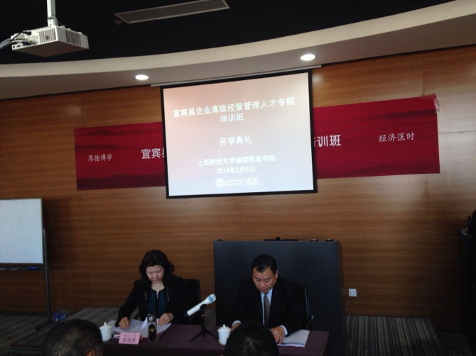2014年5月6日上午,宜宾县企业高级经营管理人才专题培训班开班典礼在我校中山北一路校区博思楼403教室隆重举行。出席本次开学典礼的嘉宾有:中共宜宾县县委副书记张瑞英女士,上海财经大学继续教育学院院长门峰教授。