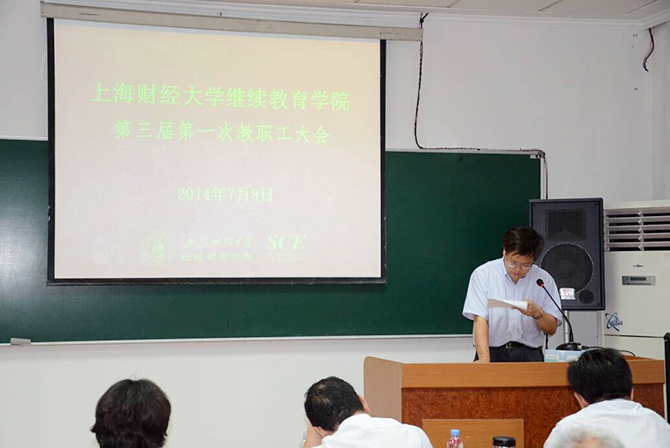 2014年7月8日,上海财经大学继续教育学院第三届第一次教职工大会在中山北一路校区顺利召开。门峰院长做了《上海财经大学继续教育学院2013-2014学年行政工作报告》与《上海财经大学继续教育学院2013年财务工作报告》,工会主席潘侠新老师做了《上海财经大学继续教育学院工会第三届一次教职工大会工作报告》。全体参会的教职工对大会报告进行了认真热烈的讨论和审议,积极为学院的发展建言献策。