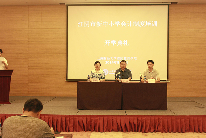 2014年8月5日,“江阴市新中小学会计制度培训(第二期)”开班典礼在我校中山北一路校区博思楼隆重举行。出席本次开班典礼的领导有:江阴市教育局计财科副科长谭华先生、江阴市财政局教科文科副科长潘晓岚女士、上海财经大学继续教育学院院长门峰教授。