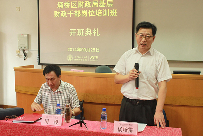2014年9月25日,“�桥区财政局基层财政干部岗位培训班”开班典礼在我校中山北一路校区第五教学楼隆重举行。出席本次开班典礼的领导有:�桥区财政局党组成员、纪检组长周峻先生,上海财经大学继续教育学院党总支书记杨培雷先生。