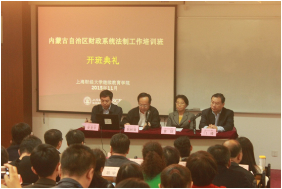 2015年11月9日,内蒙古自治区财政系统法制工作培训班在我校中山北一路校区第七教学楼202教室隆重举行。出席本次开班典礼的领导有:内蒙古自治区财政厅党组成员、副厅长韩树清先生、内蒙古自治区财政厅法制处处长史圣平先生、上海财经大学副校长黄颖女士、上海财经大学继续教育学院院长门峰先生。