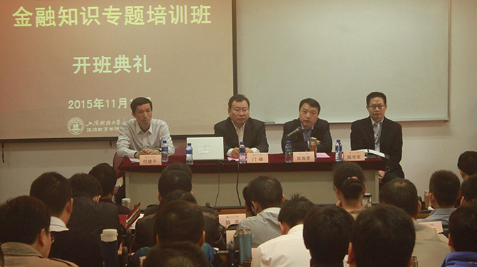 2015年11月16日上午8:30,某市年轻干部金融知识专题培训班开班典礼在我校中山北一路校区第七教学楼隆重举行。某市委组织部副部长敖先生、上海财经大学继续教育学院院长门峰先生、某市委组织部副县级组织员曾先生、某市委党校常务副校长陈先生、某市委党校副校长付先生出席了本次开班典礼。