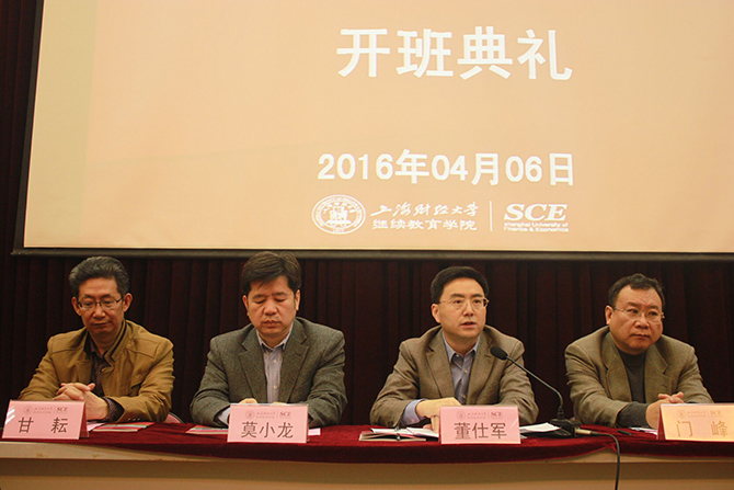 4月5日,由广西壮族自治区财政厅主办、上海财经大学继续教育学院承办的“2016年广西自治区财政厅清洁发展委托贷款业务培训班”开班典礼在我校中山北一路校区举行。广西自治区财政厅党组成员、副厅长董仕军先生,中国清洁发展机制基金管理中心副主任莫小龙先生,广西自治区财政厅国际金融合作处处长甘耘先生,上海财经大学继续教育学院院长门峰先生出席了开班典礼。开班典礼由上海财经大学继续教育学院政企培训部主任朱志军先生主持。