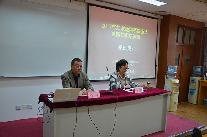 2017年2月14日,某市地税系统全员更新知识培训班在我校中山北一路校区第七教学楼202教室隆重举行开班典礼,出席本次开班典礼的领导有:某县地税局党组书记管玉屏、上海财经大学继续教育学院院长门峰。