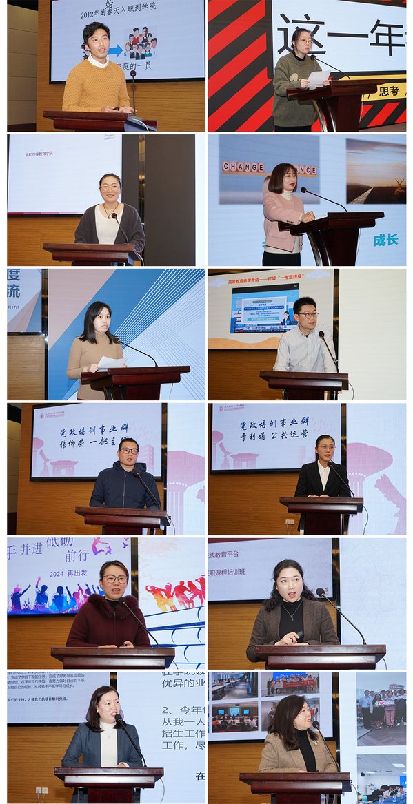 随后,来自学院各部门的14名教职工代表进行工作交流分享,大家立足各自工作岗位,充分交流了一年来的工作感悟和收获体会,充分展现出2023年学院上下努力拼搏的态度、推进改革的决心、加速前进的步伐、协作共赢的生态、边干边学的常态和坚定不移的信心。