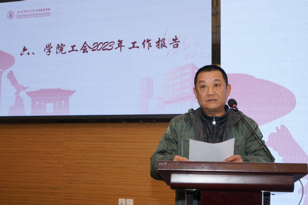 工会副主席周磊作学院工会2023年工作报告。这一年来,学院工会用心用情关心关爱教职工,扎实做好“两送三助”,切实做好权益保障,主动关心好离退休教职工、在岗教职工和特殊群体。积极助力学院市场化改革,在涉及教职工切身利益的薪酬方案及其配套细则制订过程中,充分听取教职工意见建议,切实保障职工权益,为学院决策提供有力参考。通过思想引领、文化凝心、活动聚力,发挥工会凝心聚力作用。组织开展陈云纪念馆见学、乡村振兴成果体验和各类文体活动,让教职工能以更加健康的体魄和更加旺盛的经历投入工作,增强对学院和学校的归属感和认同感。重视妇女工作,关心女教职工,激发“巾帼力量”。妇女小组积极组织“香薰蜡牌”手工制作体验等活动,缓解教职工压力、营造团结和谐氛围,为学院事业发展凝心聚力。