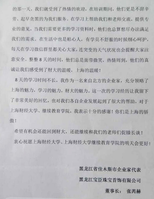 在培训结束后的一周,我们收到一封来自黑龙江省佳木斯市民营企业家的感谢信。黑龙江宝臣珠宝首饰有限公司董事长张芮赫先上在信中高度评价了本次培训班的学习效果,对上海财经大学及上海财经大学继续教育学院表示了诚挚的感谢。对负责本次培训的企业培训小组和相关负责老师在本次培训期间热情周到、专业、有效的服务给予了高度的评价。这是企业培训项目组的集体荣誉,也是上海财经大学继续教育学院培训部的骄傲,更是上海财经大学服务社会的精神体现。