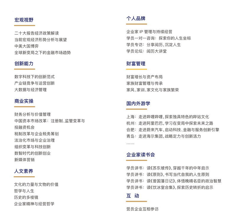 秉承“厚德博学、经济匡时”的校训,整合国内外人文、历史、哲学等领域的名家资源,设立“人文素养”模块,帮助企业家涵养人文底蕴,丰富精神世界