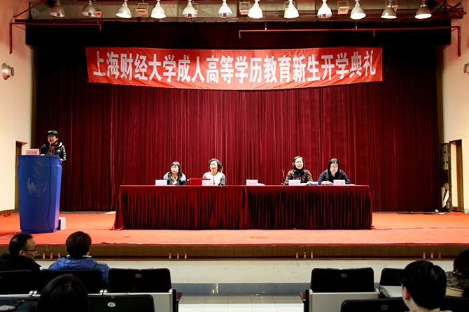 2018年3月3日上午,上海财经大学继续教育学院在中山北一路校区大礼堂举行了一场隆重、热烈的新生开学典礼。上海财经大学继续教育学院院长谭予絮,副院长林芳,学历教育部主任李军、副主任罗红,国际合作与从业资格培训部主任王蕴,2018级新生班主任以及负责招生工作的老师参加了开学典礼。