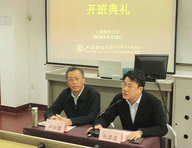2018年4月16日,上海财经大学中山北一路校区第七教学楼举行2018年度某市财政管理业务培训班的开班典礼,出席本次开班典礼的领导有某市财政局党组成员、副局长卢永健先生,上海财经大学继续教育学院党总支书记张彦波先生。