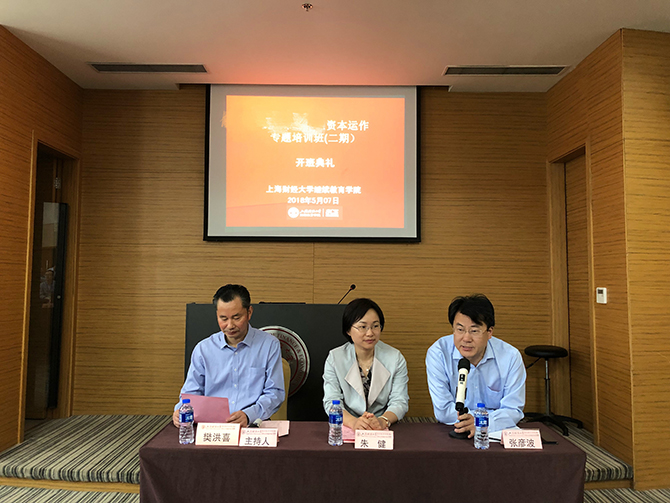 2018年5月06日,由某地政府、上海财经大学继续教育学院合作举办的“国资企业家资本运作专题培训班二期”开班典礼在我校中山北一路校区举行。出席本次开班典礼的领导有:政府副区长朱健同志、区发改委樊洪喜同志、上海财经大学继续教育学院党总支书记张彦波同志。
