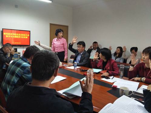 2018年10月30日下午一点三十分在上海财经大学中山北一路校区第六教学楼509室,继续教育学院总支委员会召开党员大会,进行新一届总支委员的选举。学院全部18名正式党员济济一堂,大会由本届总支委员李军同志支持。