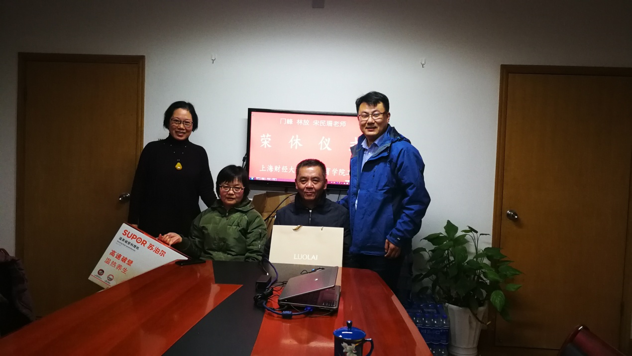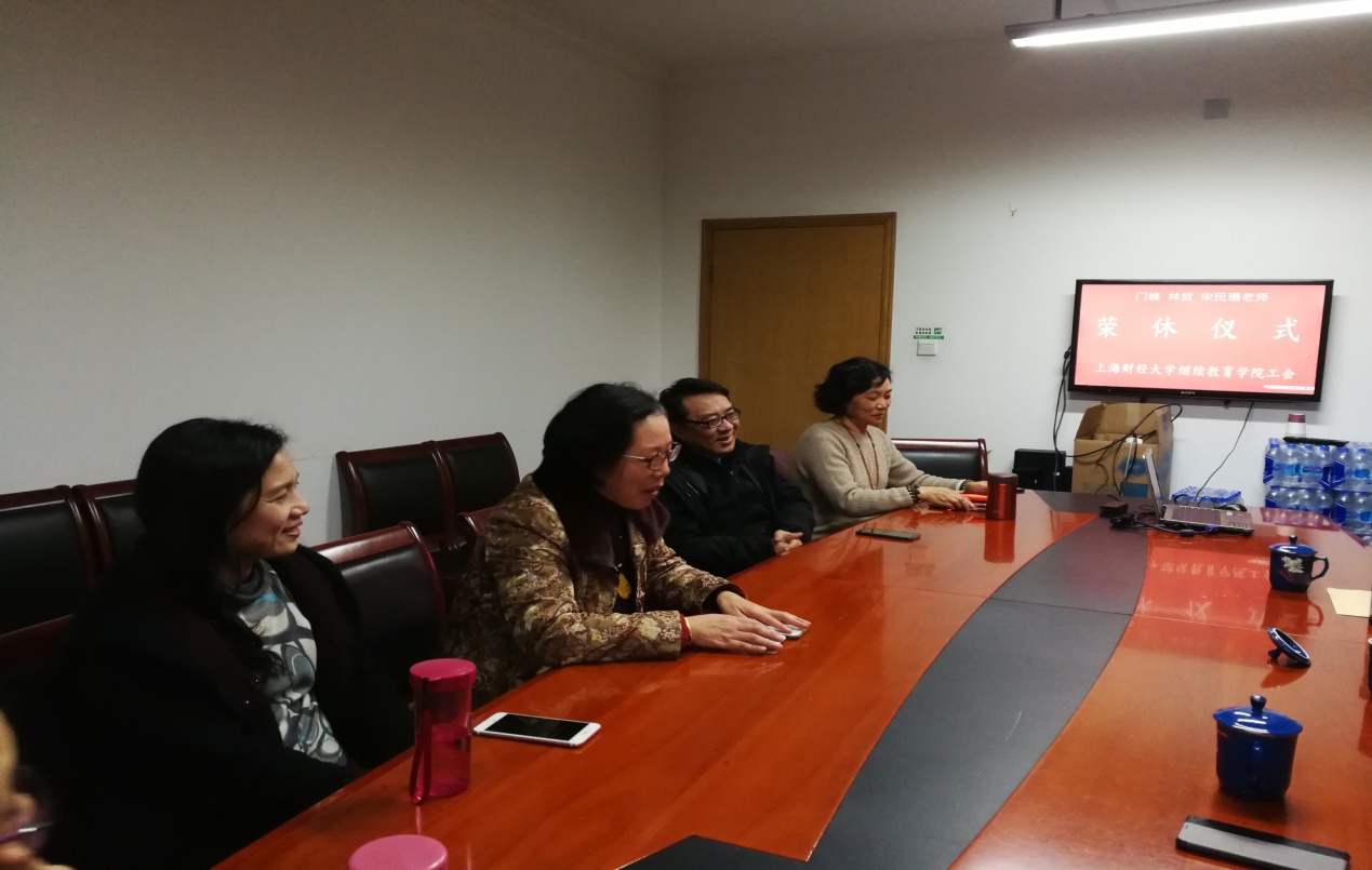 2018年12月19日下午三点钟在中山北一路校区第六教学楼509会议室,继续教育学院首次为2018年光荣退休的门峰、林放、宋民珊老师举行荣休仪式。
