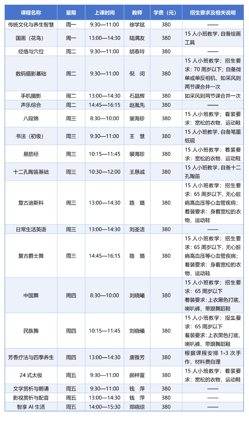 2026年春季学期将于3月16日开课,开设20门普惠课程,包括健康养生、人文艺术、数字生活等多个方向课程,欢迎大家选报。