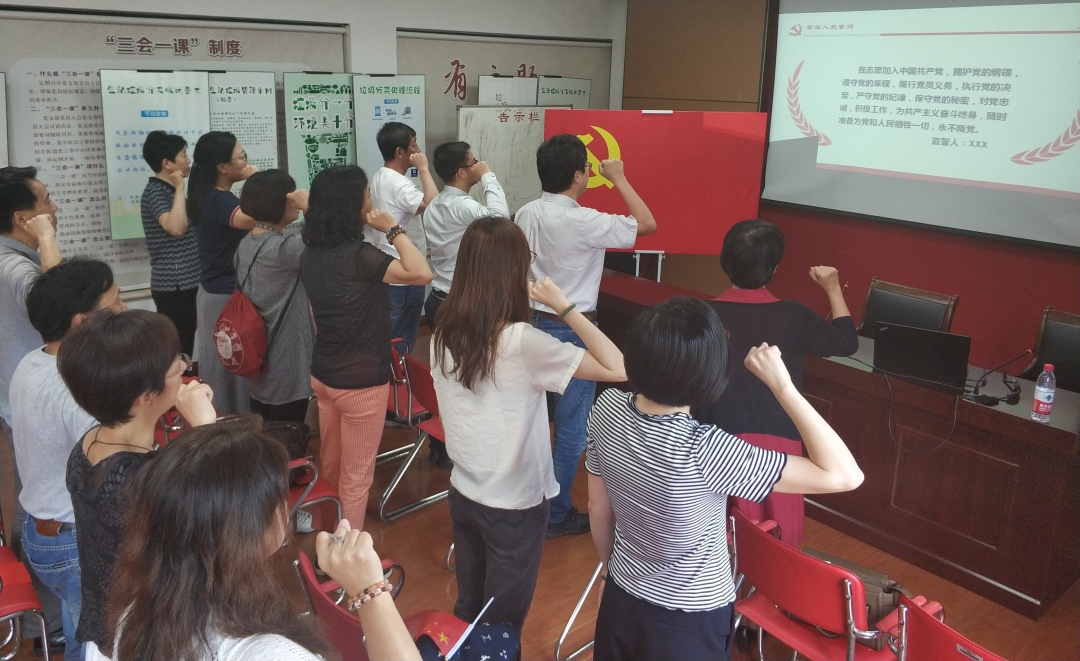 义卖活动结束后,全体党员在党总支的组织下,进行了“我和我的祖国”主题党日活动的其他环节。全体党员奏唱国歌,并重温了入党誓词。重温誓词中的每一句誓言,那是我们加入共产党的初心,在中华人民共和国70周年国庆之际,我们在誓词中感受到了自己新时代的使命,我们将更加牢记使命、奋勇向前!全体党员为祖国献歌,《我和我的祖国》歌声响起,“我的祖国和我,像海和浪花一朵,浪是那海的赤子,海是那浪的依托...”,激起了全体党员的爱国之心。歌声渐息,第一支部书记江红老师、第二支部书记沈雄老师及全体党员分别诵读了《人间正道是沧桑》《雄关漫道真如铁》《长风破浪会有时》三篇文章的节选,诵读者激情澎湃,全体党员感慨祖国的发展不易,“70年披荆斩棘,70年风雨兼程”“一路走来,中国人民自力更生、艰苦奋斗,创造了举世瞩目的中国奇迹”“风正劲,帆高悬,中国号巨轮向着梦想劈波斩浪”“以梦想为岸、以团结作帆、以奋斗划桨,在浩荡的时代东风中,向着下一个光辉的70年启航”。